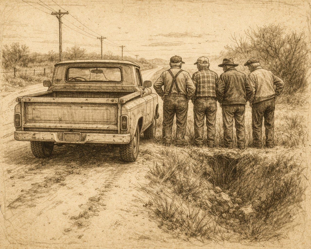 One of them reeked of cigarettes and whiskey. Marlboros and Jim Beam: Smelled like my uncle used to. Another had motor oil under his nails, the kind you can’t wash out. His boots were cracked at the heel, farm sod crusted up the sides. Down from Cochota. From the diner. The older one had a wedding ring. Plain. Scratched.