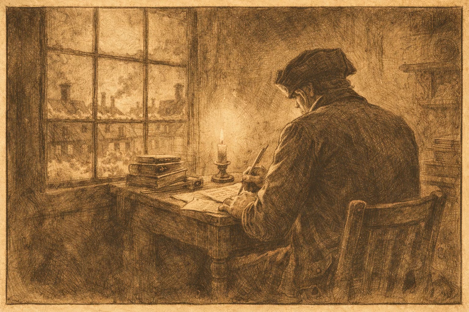 I hold the pamphlet with both hands. I am aware, suddenly and sharply, that this is the last moment it will ever belong to me. Once it leaves, it will be read aloud in taverns. Folded into coats. Quoted badly. Misunderstood. Improved upon. Used. I have written many words. None like these.